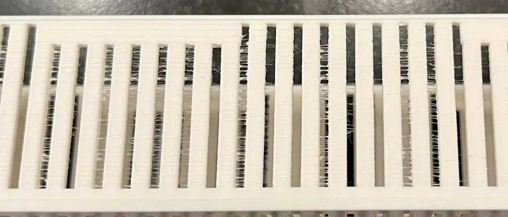 Bij het printen van een houder voor silicagel, werden heel veel draden getrokken, zie foto. Na het drogen was dat probleem opgelost.